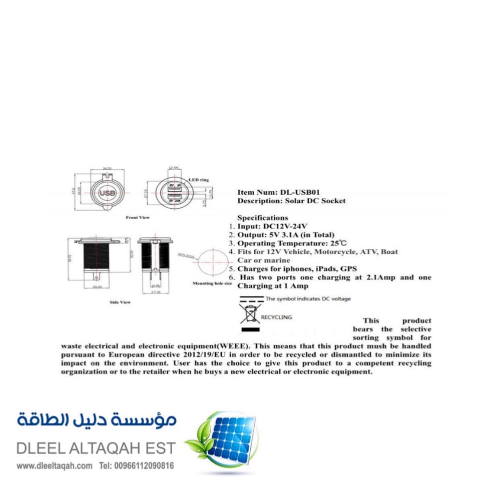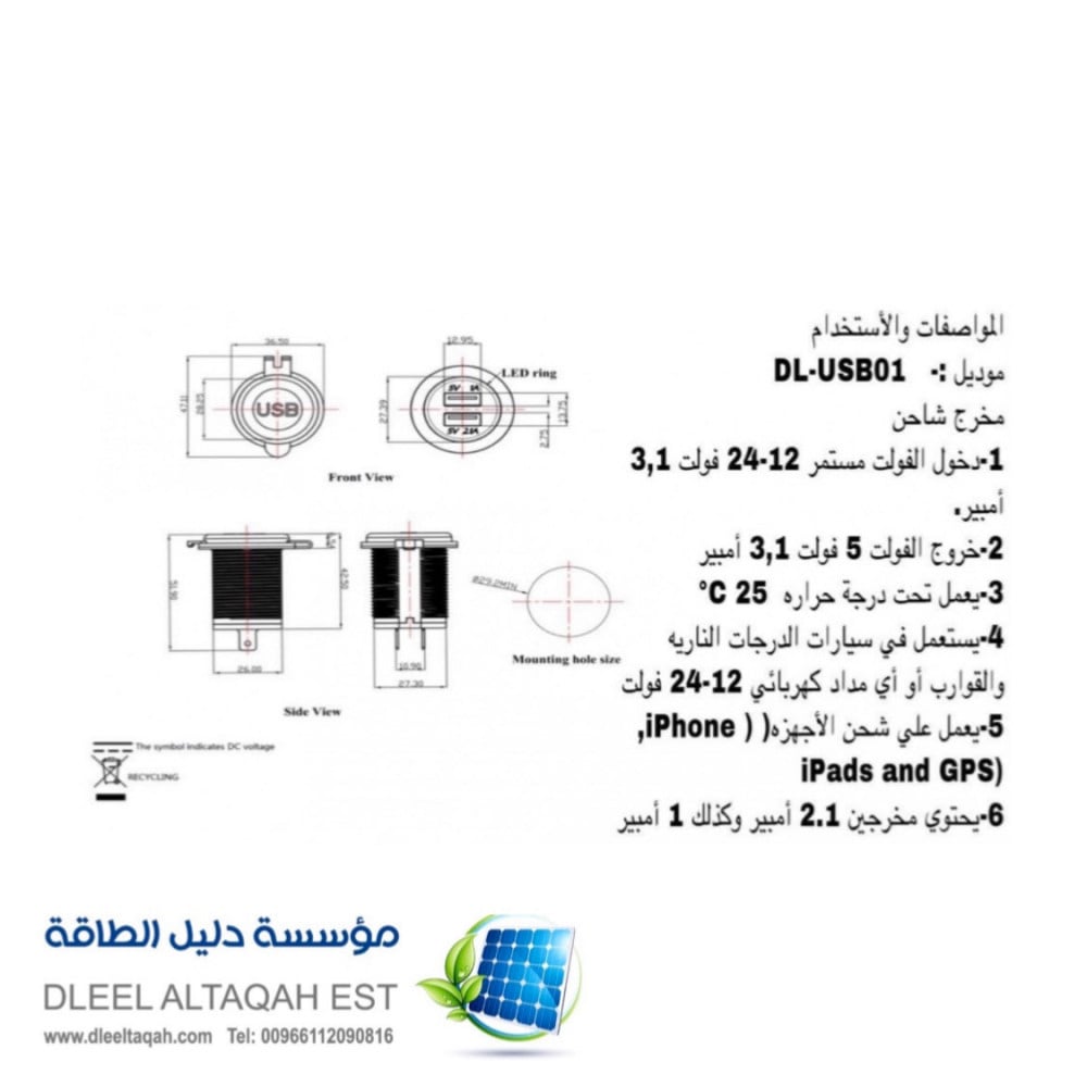 يو اس بي يعمل علي 12/24 فولت ذو مخرجين ، الخارج 5 فولت ( مخرج بقدرة 2.1 امبير المخرج الثاني 1 امبير ) يتوفر عليه وفيوز حسب الطلب .